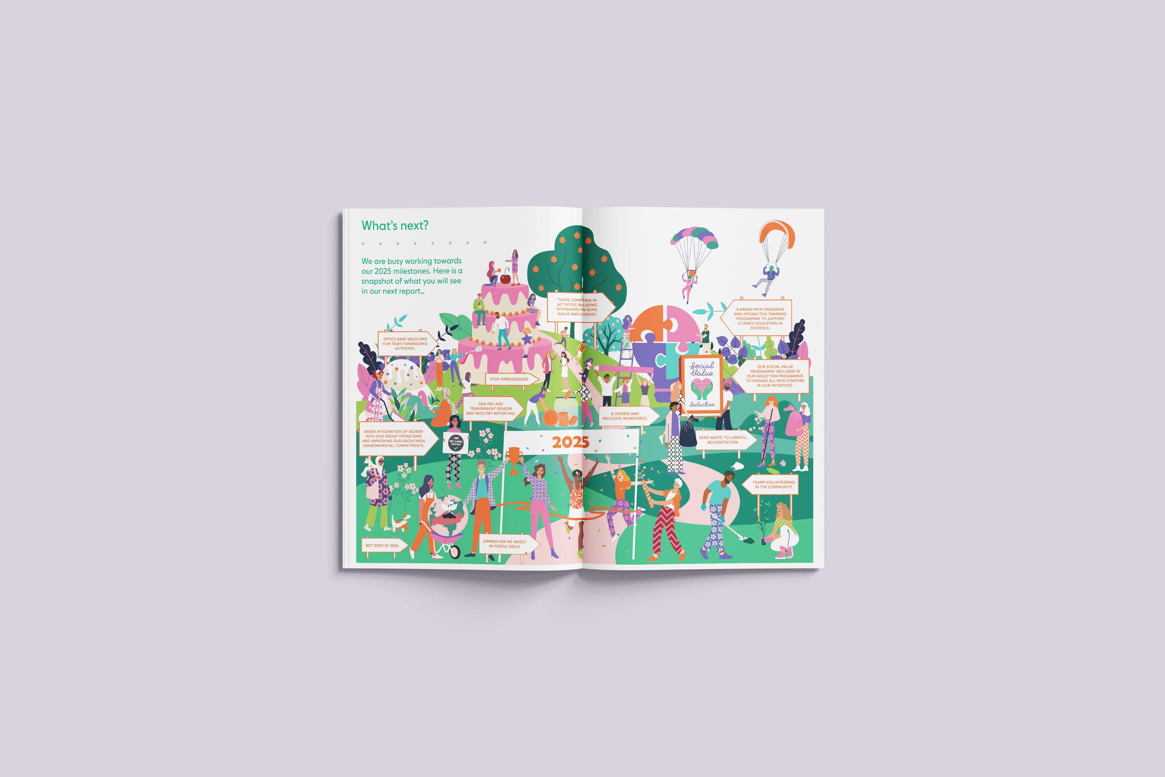 Illustration replaced stock imagery to create a more distinctive visual language, while infographics were used to simplify complex information, particularly around achievements and future priorities.